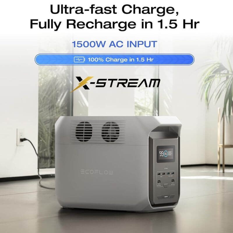 The EcoFlow Delta 3 1500 portable power station redefines fast charging with multiple high-speed options to keep you powered up wherever you are. With a 1500W AC input, it charges from 0 to 100% in just 1.5 hours, making it one of the fastest in its class. Prefer solar? Recharge via solar panels in only 3.5 hours for clean, off-grid energy. On the road? The 800W EcoFlow Alternator Charger provides a full charge in 2.1 hours while you drive. For maximum flexibility, both the EcoFlow Smart Generator and Hybrid Charging (AC + Solar) can deliver a full charge in just 1.5 hours as well. Whether at home, in your RV, or off-grid, the Delta 3 1500 ensures you're never left without reliable power.