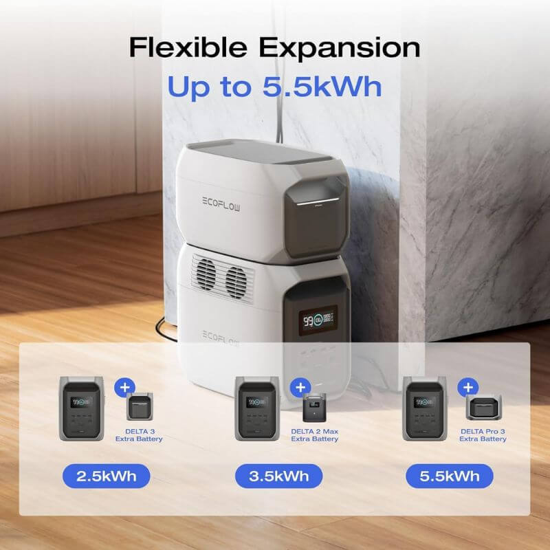 The EcoFlow DELTA 3 1500 is compatible with most EcoFlow expansion batteries (sold separately). Connect your D3 1500 to any of these batteries to expand your power station's capacity from 1kWh up to 4kWh.
